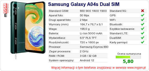 Dane telefonu Samsung Galaxy A04s Dual SIM na Twojej stronie