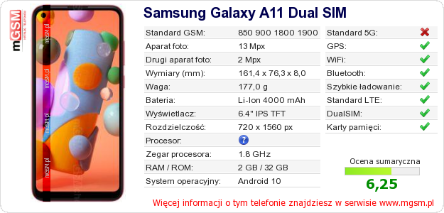 Dane telefonu Samsung Galaxy A11 Dual SIM na Twojej stronie