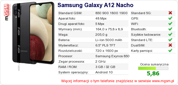 Dane telefonu Samsung Galaxy A12 Nacho na Twojej stronie