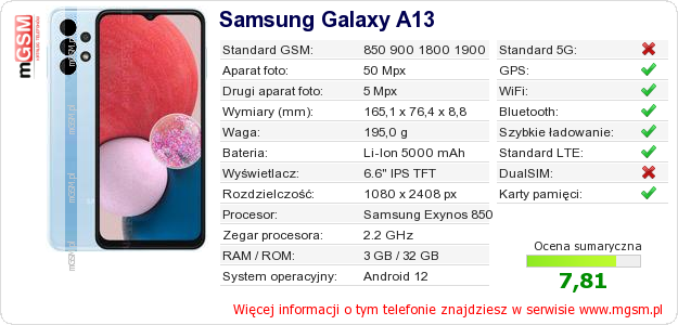Dane telefonu Samsung Galaxy A13 na Twojej stronie