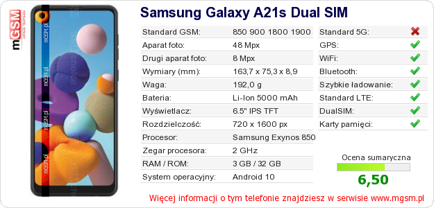 Dane telefonu Samsung Galaxy A21s Dual SIM na Twojej stronie