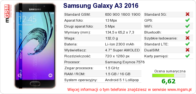 Dane telefonu Samsung Galaxy A3 2016 na Twojej stronie