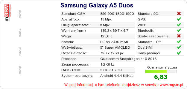 Dane telefonu Samsung Galaxy A5 Duos na Twojej stronie