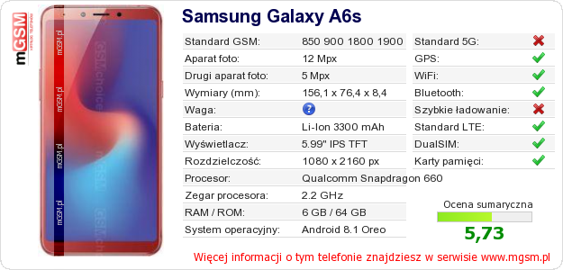 Dane telefonu Samsung Galaxy A6s na Twojej stronie