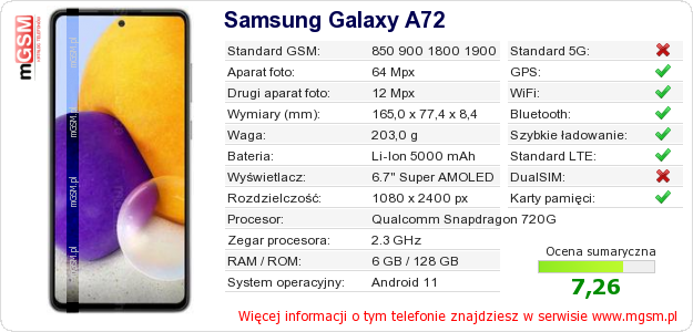 Dane telefonu Samsung Galaxy A72 na Twojej stronie