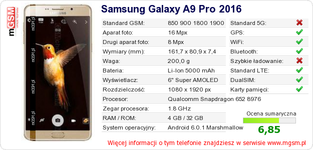 Dane telefonu Samsung Galaxy A9 Pro 2016 na Twojej stronie