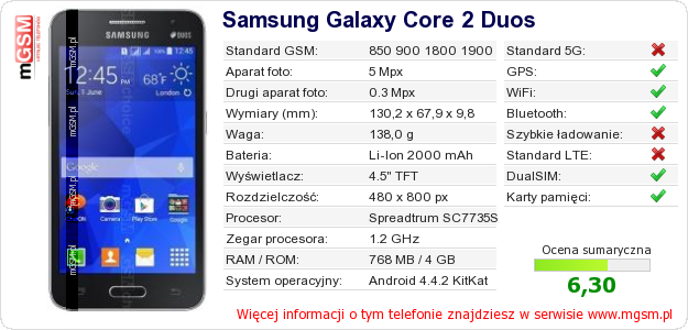 Dane telefonu Samsung Galaxy Core 2 Duos na Twojej stronie