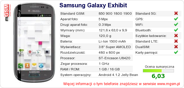 Dane telefonu Samsung Galaxy Exhibit na Twojej stronie