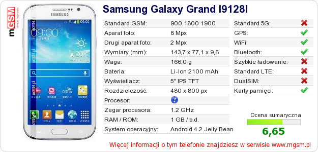 Dane telefonu Samsung Galaxy Grand I9128I na Twojej stronie
