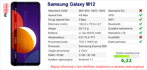 Dane telefonu Samsung Galaxy M12 na Twojej stronie