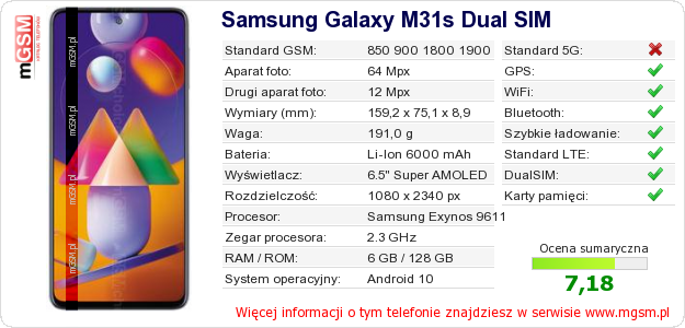 Dane telefonu Samsung Galaxy M31s Dual SIM na Twojej stronie