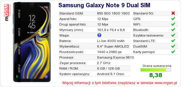 Dane telefonu Samsung Galaxy Note 9 Dual SIM na Twojej stronie