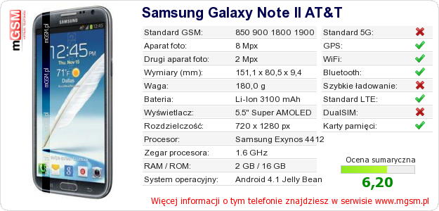 Dane telefonu Samsung Galaxy Note II AT&T na Twojej stronie