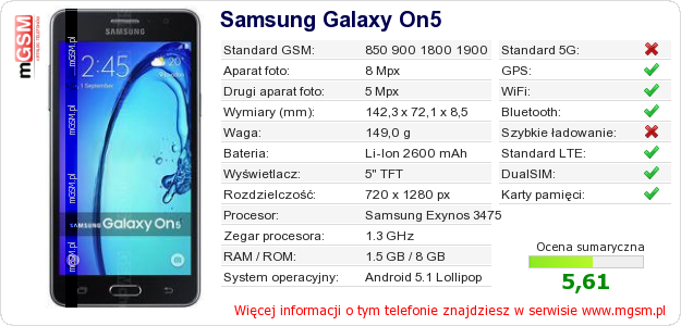 Dane telefonu Samsung Galaxy On5 na Twojej stronie