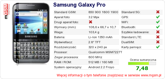 Dane telefonu Samsung Galaxy Pro na Twojej stronie