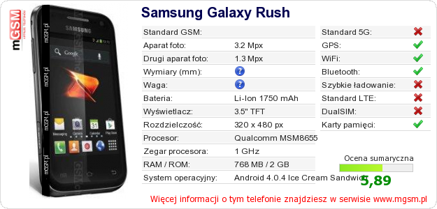 Dane telefonu Samsung Galaxy Rush na Twojej stronie