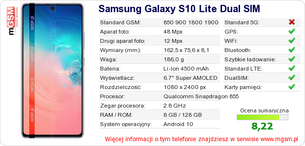 Dane telefonu Samsung Galaxy S10 Lite Dual SIM na Twojej stronie