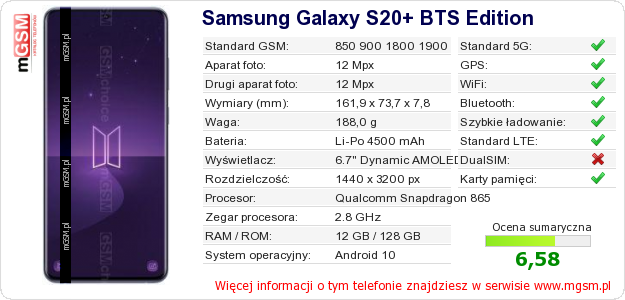 Dane telefonu Samsung Galaxy S20+ BTS Edition na Twojej stronie