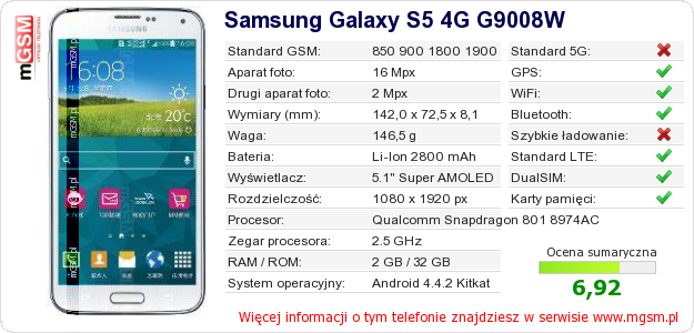 Dane telefonu Samsung Galaxy S5 4G G9008W na Twojej stronie