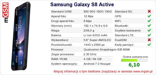 Dane telefonu Samsung Galaxy S8 Active na Twojej stronie