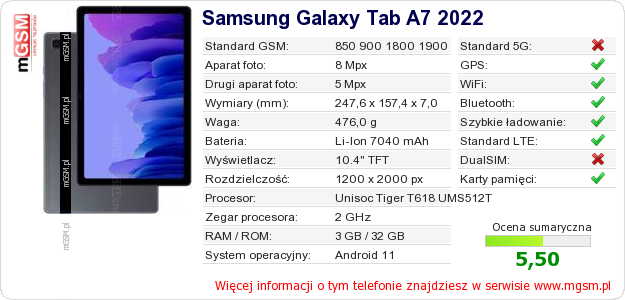 Dane telefonu Samsung Galaxy Tab A7 2022 na Twojej stronie