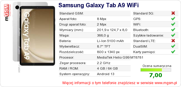 Dane telefonu Samsung Galaxy Tab A9 WiFi na Twojej stronie