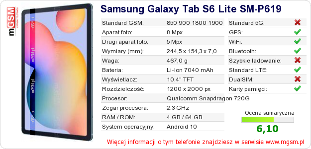 Dane telefonu Samsung Galaxy Tab S6 Lite SM-P619 na Twojej stronie