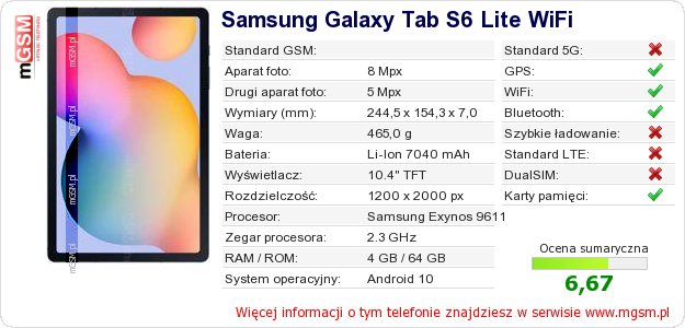 Dane telefonu Samsung Galaxy Tab S6 Lite WiFi na Twojej stronie