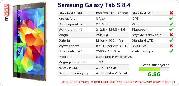 Dane telefonu Samsung Galaxy Tab S 8.4 na Twojej stronie