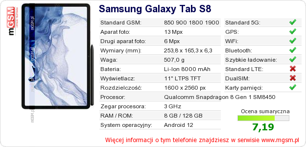 Dane telefonu Samsung Galaxy Tab S8 na Twojej stronie