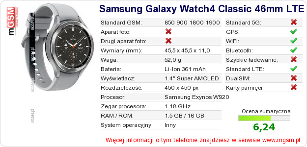 Dane telefonu Samsung Galaxy Watch4 Classic 46mm LTE na Twojej stronie