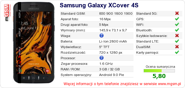 Dane telefonu Samsung Galaxy XCover 4S na Twojej stronie