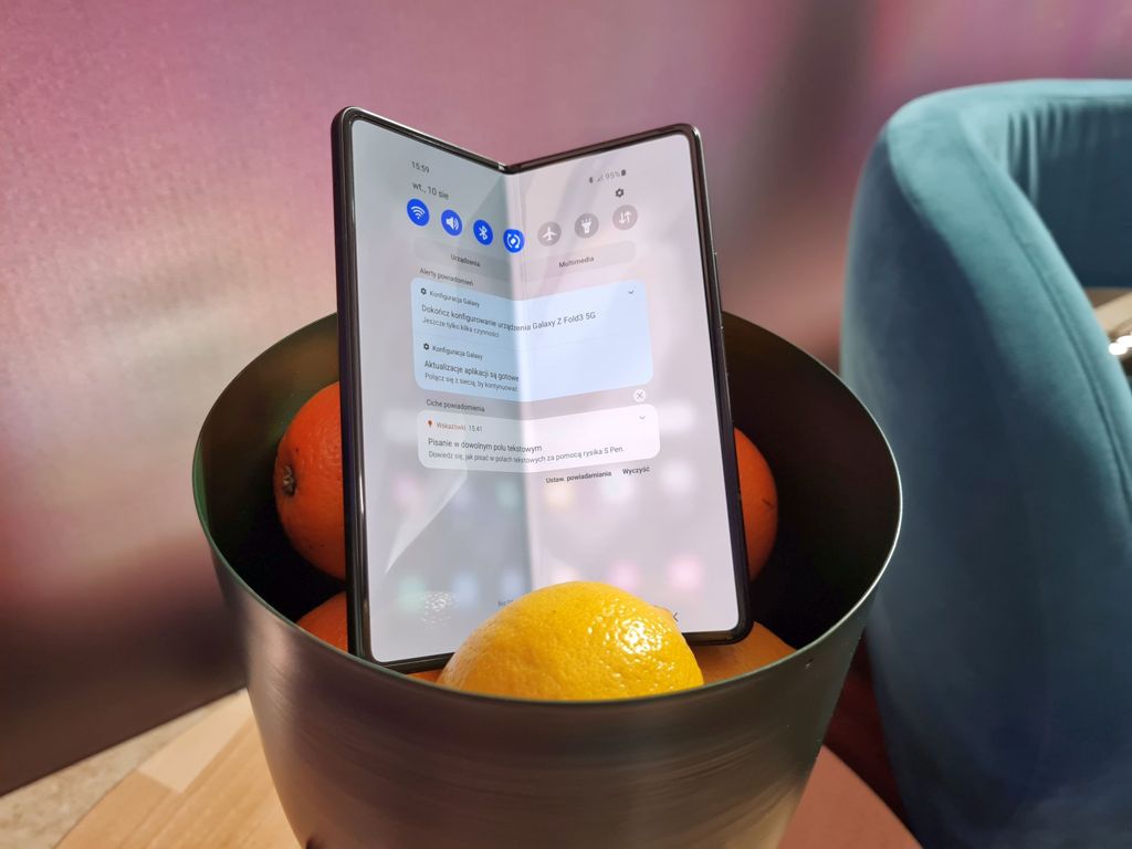 Trzecią z nowości jest aparat do selfie ukryty pod elastycznym wyświetlaczem. Tu znów zacznę od narzekania - aparat mimo wszystko pozostaje widoczny, a zdjęcia robi marne - ale po pewnym czasie nasze oczy zaczynają go ignorować - może zatem nie wyszło tak źle, jak się z początku zdawało...? Niezmiennie, Galaxy Z Fold 3 cieszy mnie dużym ekranem i praktycznością, jaką daje to rozwiązanie. Niezmiennie, smartfon ten jest znakomitym narzędziem pracy, robi przyzwoite zdjęcia, oferuje wysoką wydajność i jest nawet - wbrew pozorom - całkiem poręczny.