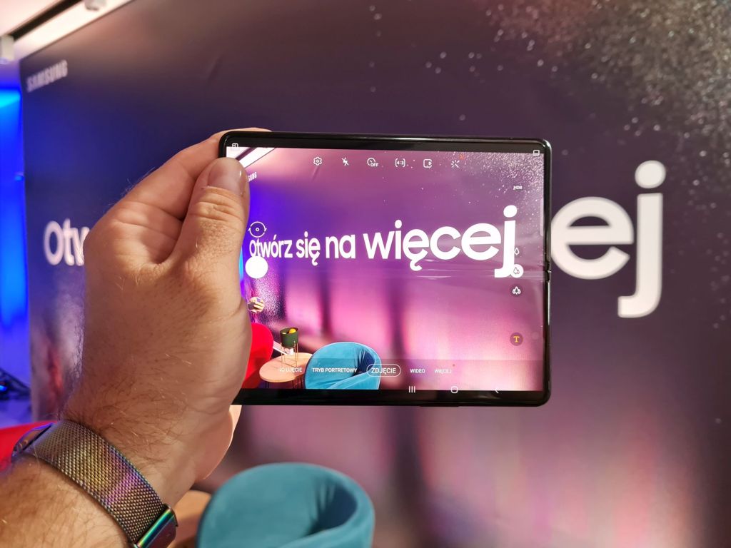 Co ważne - zastosowano w nim opcje zakładające wykorzystanie możliwości dawanych przez składaną obudowę - i umożliwiające wygodne wykonanie selfie tylnym, potrójnym aparatem. Wystarczy otworzyć obudowę i kliknąć niewielką, nieco zakamuflowaną ikonkę. O ostatnim aparacie - tym pod elastycznym ekranem - wspominam na końcu, bo chyba nie ma o czym mówić.
