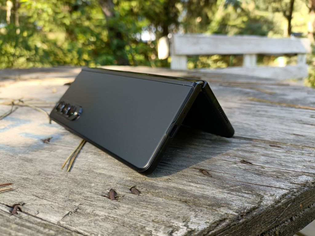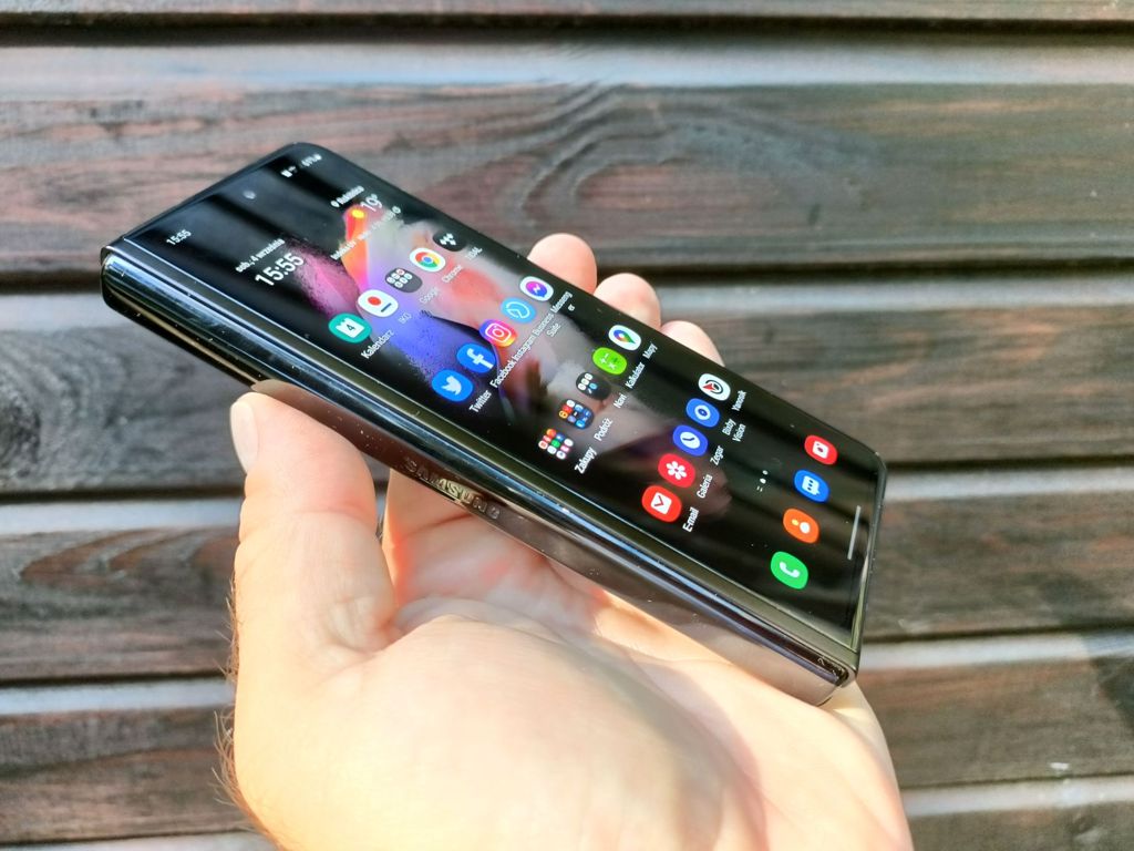 Zapytacie, czy Galaxy Z Fold 3 można uznać za poręczny sprzęt. Moim zdaniem - można. Złożony jest wąski, choć gruby. Dzięki temu, możemy go łatwo objąć dłonią, a do tego wygodnie rozmawiać, przytrzymując telefon ramieniem, bez obaw, że się wysunie. Rozkładanie i składanie jedną ręką jest możliwe - ale wygodniej czynić to oburącz. Co najważniejsze - telefon można ustawić w pozycji półotwartej i uczynić z niego coś na kształt małego laptopa.