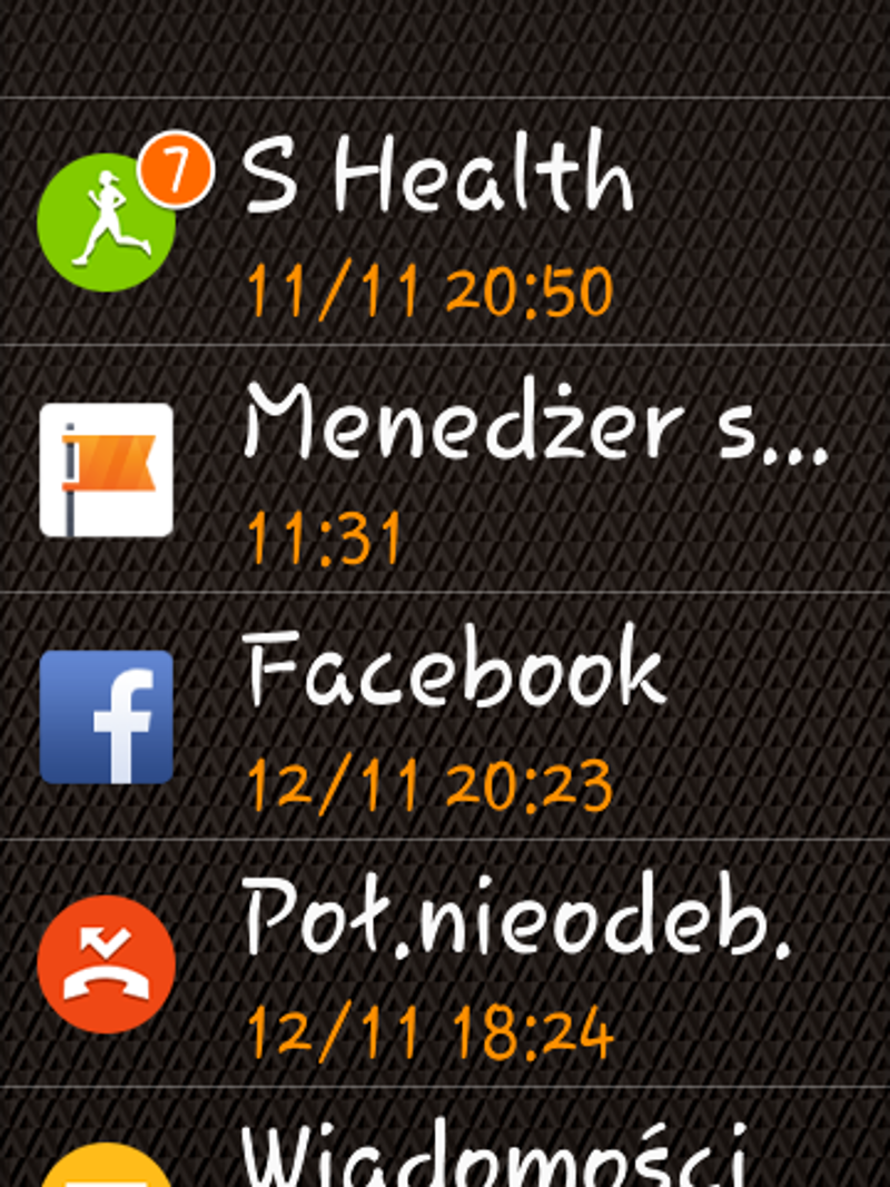 Przesuwając się w górę, wejdziemy do menu aplikacji. Odepchnięcie pulpitu w lewo powiedzie nas do ekranów z widżetami, zaś ruch w przeciwnym kierunku spowoduje wyświetlenie powiadomień. Wspomniałem o widżetach? Tak, to nie pomyłka, w Gear S możemy korzystać z nich niemal identycznie, jak w smartfonach. Mamy widżet S-Health, szybkiego wybierania, pogody, newsów czy kalendarza. Jest tego sporo...