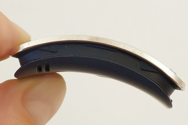 Metalowa jest również regulowana klamra spinająca pasek. Poza ciemnym, łukowatym szkłem, front zdobi metalowy, promieniście moletowany pojedynczy klawisz, po którego bokach umieszczono czujnik światła i UV. Głośnik i mikrofon zamontowano po bokach koperty.