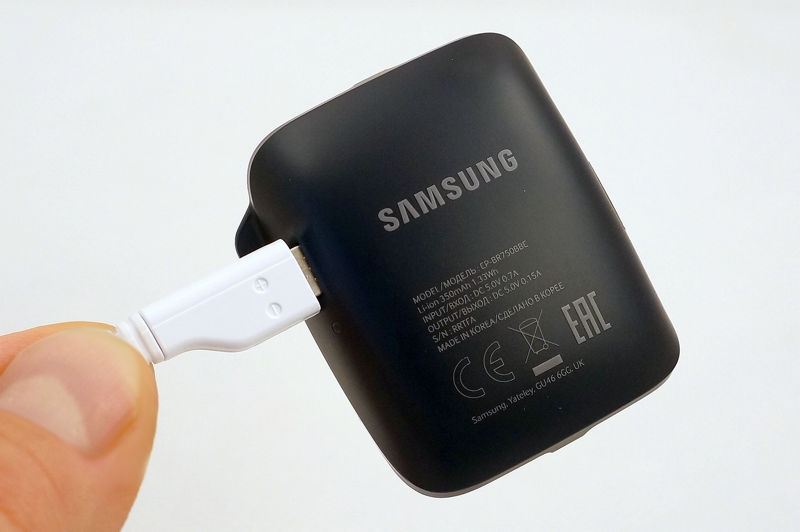 Samsung konsekwentnie stosuje w swych smartwatchach nasadki do ładowania. Drobiazg ten ma postać wykonanej z tworzywa obejmy na kopertę zegarka. Obejma łączy się z zegarkiem za pomocą metalowych styków, a dopiero do niej możemy odłączyć zasilacz z kablem microUSB, by naładować baterię. Miło, że koperty zegarka nie szpeci gniazdo microUSB, ale co będzie, gdy nasadka ładująca ulegnie uszkodzeniu, czy po prostu zagubieniu? Niewygodę rekompensuje fakt, iż w przystawce dokującej umieszczona jest dodatkowa bateria, która w sytuacji awaryjnej może doładować tę w zegarku. Mamy zatem mały, podręczny powerbank, który ładujemy równocześnie z zegarkiem - a zatem nigdy nie zapomnimy o napełnieniu go energią. Zapas prądu zgromadzony w nasadce wystarczy, by zapewnić zegarkowi kilka kolejnych godzin działania. Telefon w zegarku, którego nie muszę ładować codziennie? Kupuję!