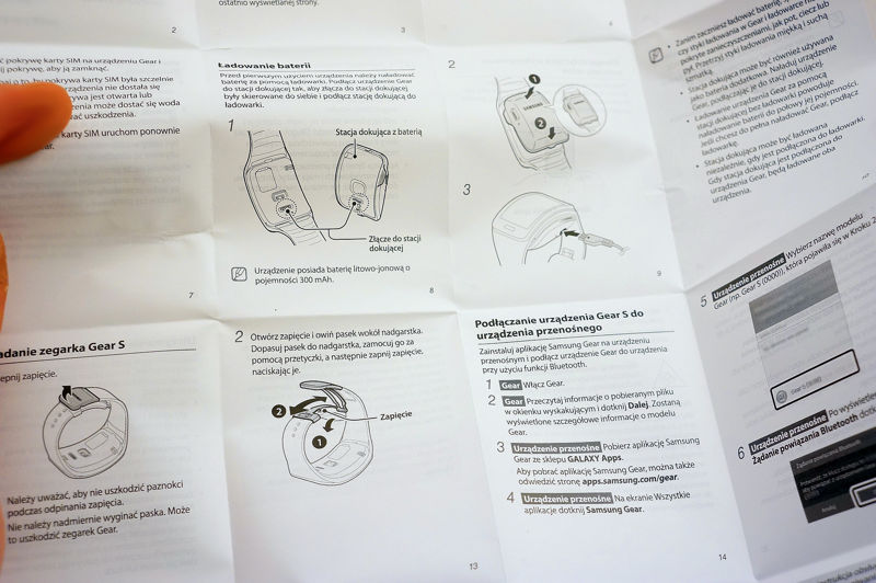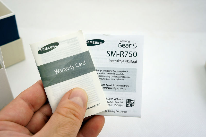 Samsung Gear S dociera do nabywcy w niewielkim pudełku, zawierającym - oprócz zegarka - zasilacz sieciowy, nasadkę do ładowania, a także zaskakująco obszerną, pełną ilustracji instrukcję.
