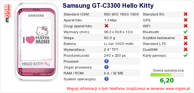 Dane telefonu Samsung GT-C3300 Hello Kitty na Twojej stronie