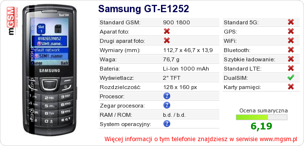 Dane telefonu Samsung GT-E1252 na Twojej stronie