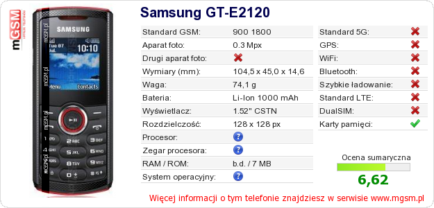 Dane telefonu Samsung GT-E2120 na Twojej stronie
