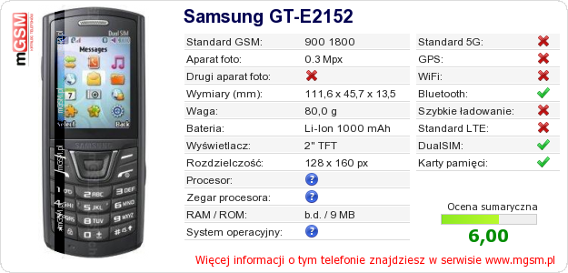 Dane telefonu Samsung GT-E2152 na Twojej stronie