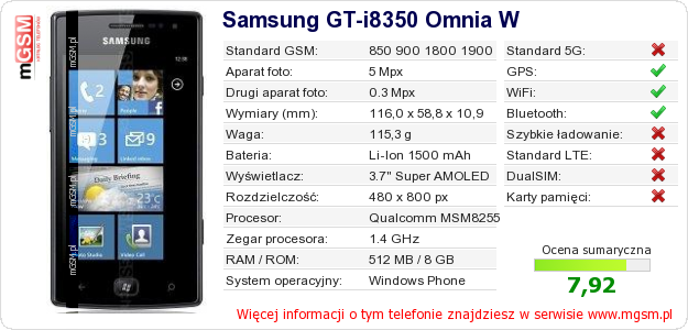Dane telefonu Samsung GT-i8350 Omnia W na Twojej stronie