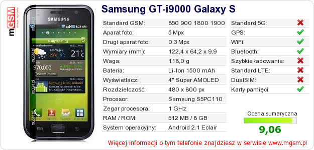Dane telefonu Samsung GT-i9000 Galaxy S na Twojej stronie