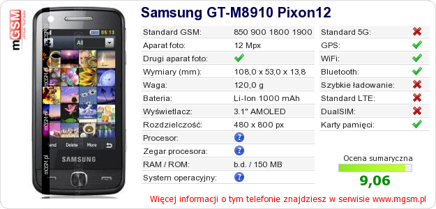 Dane telefonu Samsung GT-M8910 Pixon12 na Twojej stronie