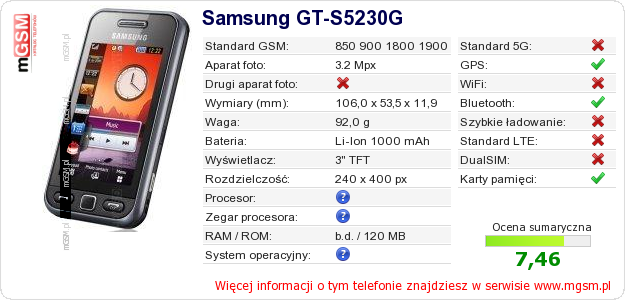 Dane telefonu Samsung GT-S5230G na Twojej stronie