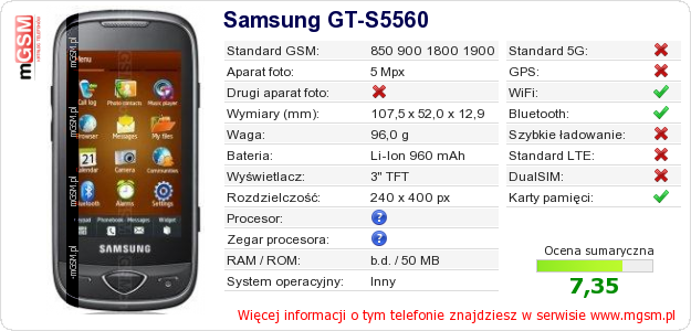Dane telefonu Samsung GT-S5560 na Twojej stronie