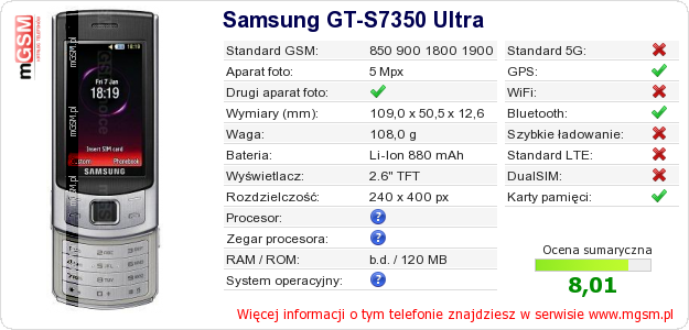 Dane telefonu Samsung GT-S7350 Ultra na Twojej stronie