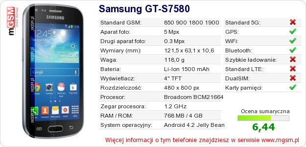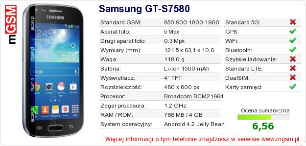 Dane telefonu Samsung GT-S7580 na Twojej stronie